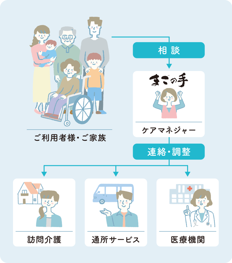 「まごの手」では利用者様およびご家族様が安心して在宅生活が送れるように、介護に関するあらゆるご相談に応じ、介護サービスのトータルサポート。