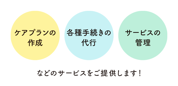 ご利用者様が可能な限り自宅で自立した生活を続けられるよう、介護支援専門員(ケアマネジャー)が心身の状態や環境、ご希望に合わせてケアプランを作成・見直しするサービスです。
